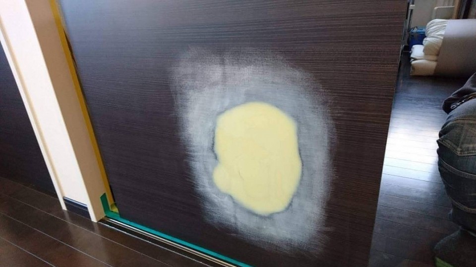 穴の中に裏板(木板)を入れたあと、グラスファイバー(ガラス繊維)パテやポリエステル樹脂パテ、下地仕上げのラッカーパテでドア穴を塞ぎ、パテ硬化後、段差や凹凸がないように当て板を使いまっ平らになるまで研磨します。…地味に時間のかかる大変な作業です。