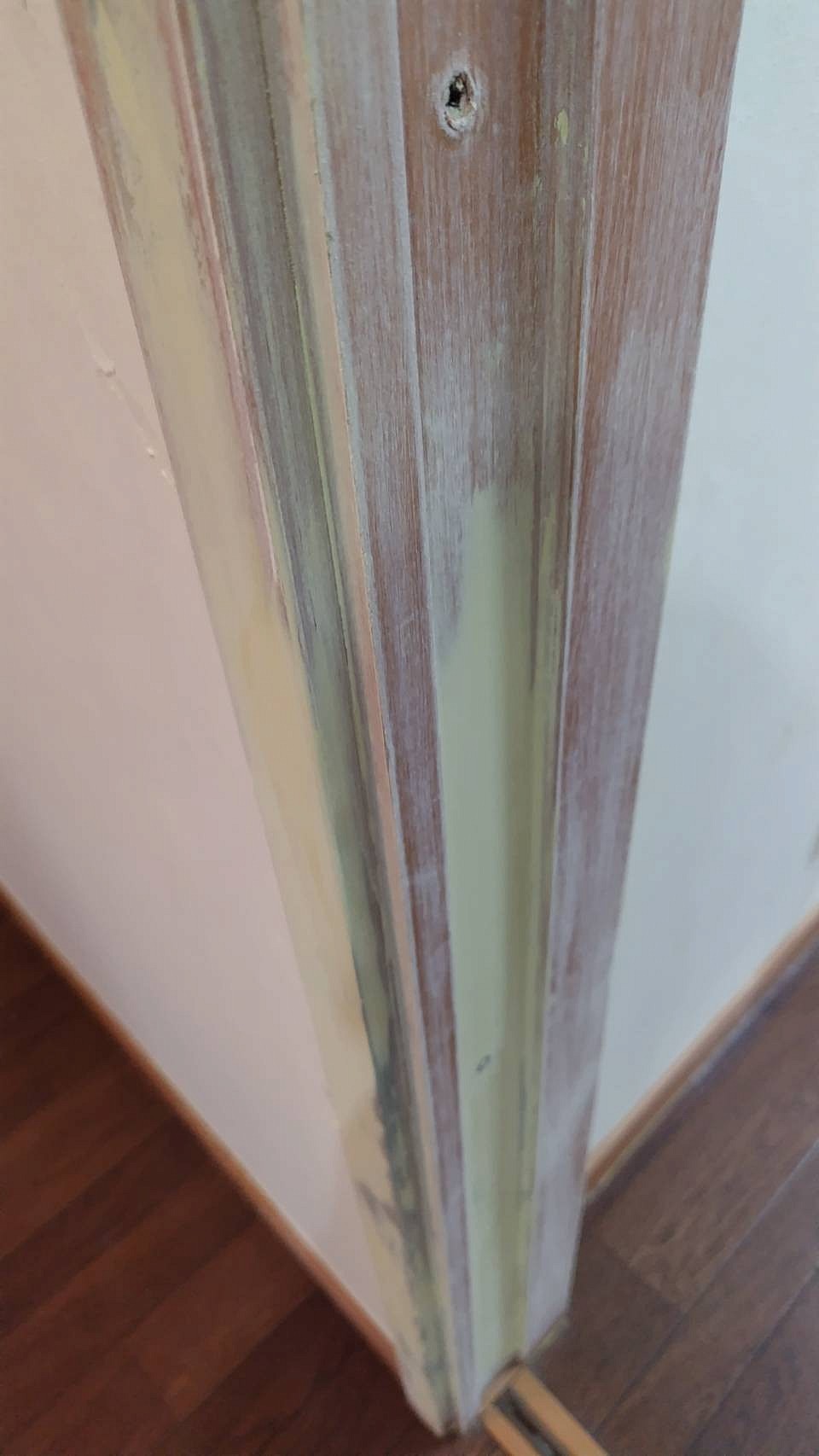 ※広い範囲でえぐれた深いキズのため、当社のペットによる傷補修の中では、難易度の高い補修案件です。さらに木目調の化粧シートを貼った枠とは違い、柱は天然木、白木なので、難易度が高く表現が難しい塗装となります。